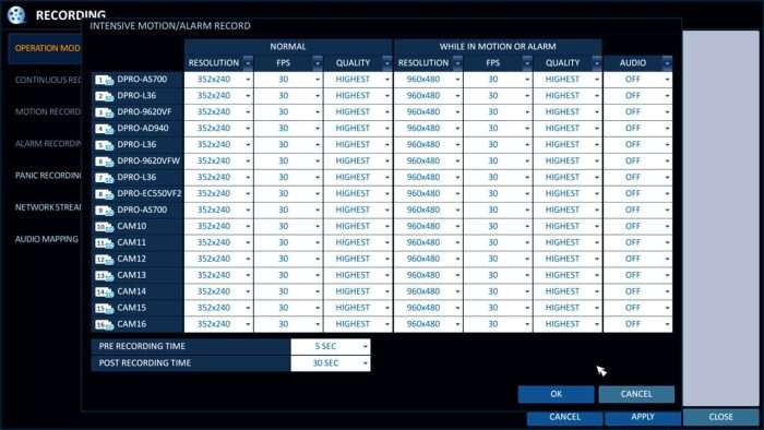 This mode is also very similar to intensive motion recording. If you select intensive motion / alarm recording, then you may configure different recording resolutions, frame rates, and video quality for when each camera is recording continuously vs. when an alarm is triggered or motion is detected. The idea behind this recording mode is to conserve space when there is no alarm or motion (by recording at a lower frame rate and resolution) and record at a higher resolution, higher frame rate and quality when an alarm is triggered or motion is detected.
