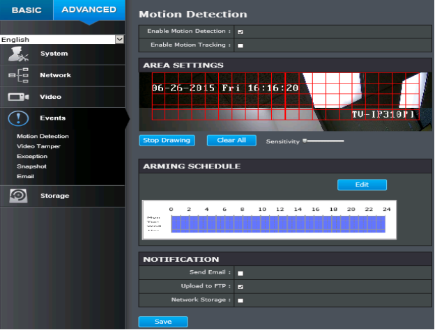 If you ordered a plan with motion detection enabled, then you must configure motion detection with your camera. Click the “Events” tab and select Motion Detection as shown below: