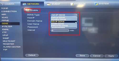 5. Login into Recorder via Web Service or Physical recorder. From the Main Menu select the network tab > Select DDNS on the left hand side. Check off “Enable” > Click on Drop down to select “No-IP”
