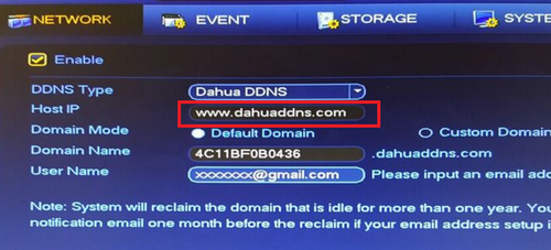 After DDNS is selected it will automatically generate a Host IP. In this case because Dahua DDNS is an option it is www.dahuaddns.com . If Quick DDNS is an option it will automatically generate the designated www.quickddns.com as the host IP.